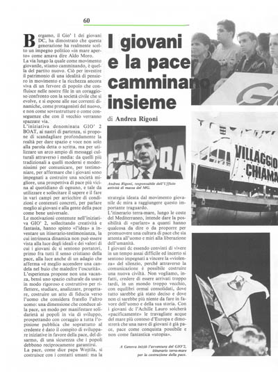 I giovani dc essendo convinti di vivere in un tempo assai difficile ed incerto si sentono impegnati a vincere la «violenza» del silenzio, perché attraverso la comunicazione è possibile costruire una nuova civiltà. Non vogliamo, infatti, credere di essere arrivati troppo tardi, in un mondo troppo vecchio, con equilibri ormai consolidati, dove tutto sarebbe già stato deciso e dove non ci sarebbe più niente da fare in favore dell'uomo e della sua storia. Con i giovani dc l'Achille Lauro solcherà