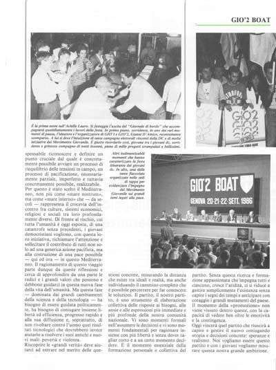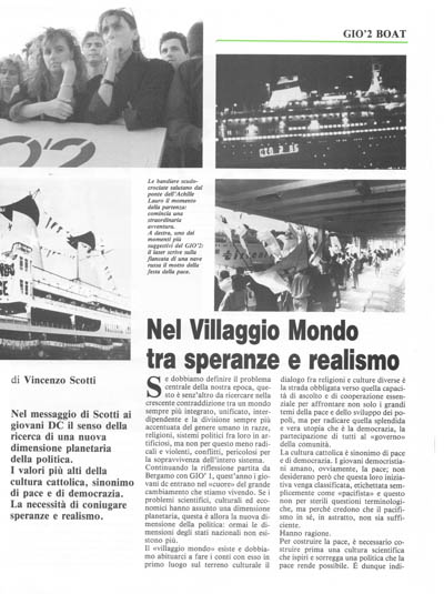 Se dobbiamo definire il problema centrale della nostra epoca, questo è senz'altro da ricercare nella crescente contraddizione tra un mondo sempre più integrato, unificato, interdipendente e la divisione sempre più accentuata del genere umano in razze, religioni, sistemi politici fra loro in artificiosi, ma non per questo meno radicali e violenti, conflitti, pericolosi per la sopravvivenza dell'intero sistema. Continuando la riflessione partita da Bergamo con 010' 1, quest'anno i giovani dc entrano nel «cuore» del grande cambiamento che stiamo vivendo. Se i problemi scientifici, culturali ed economici hanno assunto una dimensione planetaria, questa è allora la nuova dimensione della politica: ormai le dimensioni degli stati nazionali non esistono più.