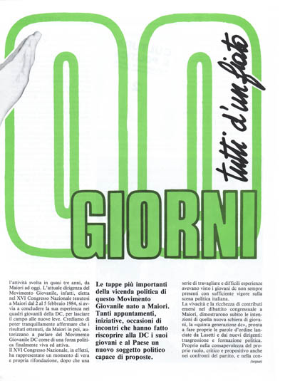 Già, perché il Gio' 2 è anche l'occasione migliore per fare, prima del prossimo congresso nazionale del Movimento Giovanile, una sorta di bilancio dell'attività svolta in quasi tre anni, da Maiori ad oggi. L'attuale dirigenza del Movimento Giovanile, infatti, eletta nel XVI Congresso Nazionale tenutosi a Maiori dal 2 al 5 febbraio 1984, si avvia a concludere la sua esperienza nei quadri giovanili della DC, per lasciare il campo alle nuove leve. Crediamo di poter tranquillamente affermare che i risultati ottenuti, da Maiori in poi, autorizzano a parlare del Movimento Giovanile DC come di una forza politica finalmente viva ed attiva.