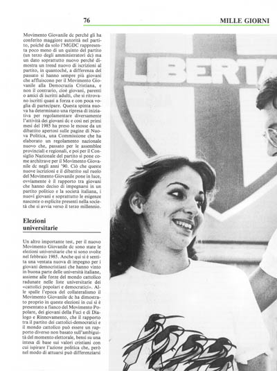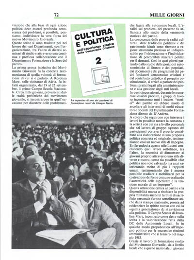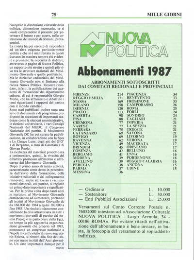 La rivista ha poi cercato di rispondere ad un'altra esigenza particolarmente sentita e che si è manifestata in questi due anni in maniera sempre più evidente e pressante: la necessità di stabilire, attraverso le pagine di Nuova Politica, un rapporto più stretto e quindi più vivo tra le strutture nazionali del Movimento Giovanile e quelle periferiche. Ma le iniziative «editoriali» del Movimento Giovanile non si limitano alla rivista Nuova Politica. Occorre ricordare, infatti, la pubblicazione dei quaderni di formazione del dipartimento cultura, di cui è responsabile Giorgio Merlo, che ha affrontato e dibattuto i temi riguardanti i rapporti del partito con il mondo cattolico.