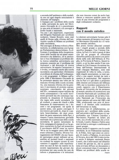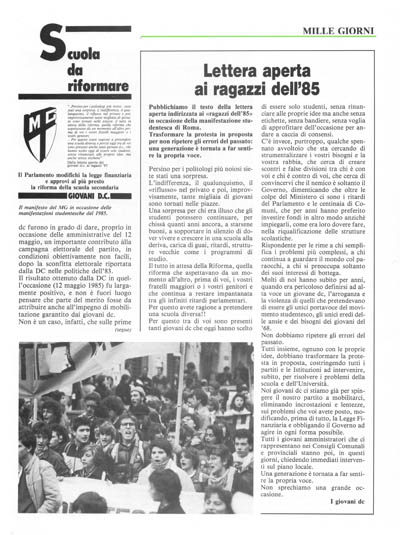 Nel convegno di Roma svoltosi a Montecitorio, in collaborazione con il gruppo Parlamentare democristiano, fu affrontato il problema della riorganizzazione delle facoltà sia sul piano amministrativo che didattico, ed in particolare si fece riferimento ai problemi della ricerca scientifiéa universitaria con proposte concrete per il problema dei ricercatori e del dottorato di ricerca universitario. In seguito l'attenzione si è rivolta, ovviamente anche alla scuola secondaria con p rticolare riferimento ai problemi di riforma dell'ordinamento e dei programi:ni. A Milano nell'aprile 1986 il Movimento Giovanile dc ha protestato .incora una volta per la mancata riforma della scuola secondaria, una mancata riforma che ha generato il movimento di protesta soprannominato «movimento dei giovani dell'85», certamente sopravvalutato da molti commentatori e da molti movimenti giovanili ma che comunque rappresenta la situazione di frustazione che regna nelle scuole secondarie fra gli studenti, a causa dei ritardi e della mancanza di rinnovamento tra i docenti e nei programmi. Ad aprile di questo anno, con questo convegno il movimento giovanile dc, dopo le «captatio benevolentiae» dei mesi precedenti da parte soprattutto della Fgci, è rimasta l'unica associazione giovanile nazionale che si preoccupa della scuola secondaria. E questo nonostante la forte campagna di stampa di cui ha goduto soprattutto la Fgci nel presentare il movimento dell'85 come un nuovo '68 in cui la maggior parte delle forze erano schierate a sinistra. Diverso l'atteggiamento del MGDC che pur facendo partecipare propri militanti ad assemblee ed incontri locali e nazionali tra studenti ha sempre cercato di non «mettere il cappello» sulle manifestazioni ma anzi di fare da tramite tra la società rappresentata dai giovani che protestano per una scuola che non dà cultura e preparazione e le istituzioni che non riescono ormai da molte legislature a muovere qualche passo nel verso di una riforma dei programmi e degli ordinamenti scolastici.