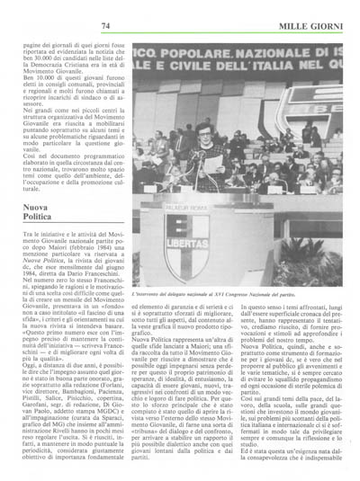 Tra le iniziative e le attività del Movimento Giovanile nazionale partite poco dopo Maiori (febbraio 1984) una menzione particolare va riservata a Nuova Politica, la rivista dei giovani dc, che esce mensilmente dal giugno 1984, diretta da Dario Franceschini. Nel numero zero lo stesso Franceschini, spiegando le ragioni e le motivazioni di una scelta così difficile come quella di creare un mensile del Movimento Giovanile, presentava in un «fondo» non a caso intitolato «il fascino di una sfida», i criteri e gli orientamenti su cui la nuova rivista si intendeva basare.