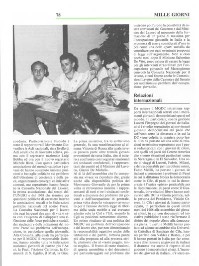Da sempre il MGDC intrattiene rapporti internazionali serrati con i movimenti giovanili democristiani sparsi nel mondo. In particolare, con la gestione Lusetti l'impegno dei giovani dc italiani si è rivolto soprattutto ai movimenti giovanili democristiani dei paesi che soffrono sotto la dittatura o in cui la DC viene colpita in maniera poco leale. Ciò ha portato ad una serie di relazioni strettissime soprattutto con i paesi sudamericani con i giovani dc cileni, con quelli dei paesi del Centro America che vivono situazioni particolari come in Nicaragua o in El Salvador. Una serie di viaggi di Lusetti, Fabris, Milani, e del responsabile per i problemi esteri, Fabio Melilli, ha portato i giovani dc italiani a conoscere i problemi di Paesi in cui la dittatura blocca la democrazia come in Cile, di paesi in cui la democrazia è l'unica «pista» praticabile per la ricostruzione, di paesi come il Guatemala, dove elezioni libere hanno assicurato alla DC la vittoria politica, nella persona del Presidente, Vinicio Cerezo. In Cile i giovani dc hanno partecipato, in particolare in questi ultimi mesi del 1986 alle assemblee dei giovani cileni, in cui con documenti ed iniziative pubbliche è stato riaffermato il diritto del popolo cileno alla democrazia piena. Lusetti e Melilli hanno parlato ad alcune assemblee alla Università Cattolica di Santiago del Cile, hanno parlato con Valdes e Bustos, e poi li hanno portati in Italia per far conoscere direttamente ai giovani dc italiani il dramma ma anche il rispetto di cui godono i democristiani cileni. L'incontro dei giovani dc italiani, c'è stato anche con Duarte ed i democristiani salvadoregni impegnati in prima linea in · un Paese in cui il massimalismo della sinistra e il reazionarismo della destra impongono alla DC, uscita vincitrice dalle urne nonostante l'astensionismo della sinistra e i brogli della destra, di essere veramente il Partito-guida, sul piano morale e politico del Paese e la garanzia sul piano internazionale di un Paese che veleggia pur con le difficoltà economiche e civili del caso verso una democrazia possibile.
