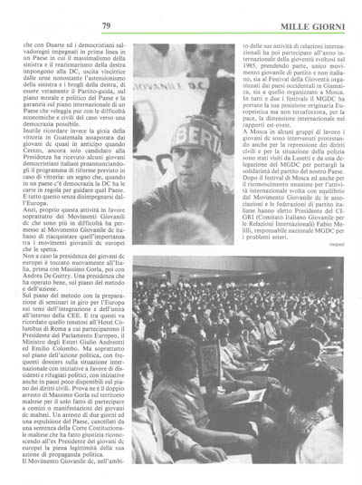 Inutile ricordare invece la gioia della vittoria in Guatemala assaporata dai giovani dc quasi in anticipo quando Cerezo, ancora solo candidato alla Presidenza ha ricevuto alcuni giovani democristiani italiani preannunciandogli il programma di riforme previsto in caso di vittoria: un segno che, quando in un paese c'è democrazia la DC ha le carte in regola per guidare quel Paese. E tutto questo senza disimpegnarsi dall'Europa.