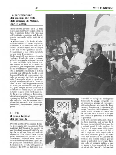 In un clima di forte entusiasmo la prima festa nazionale dei giovani dc di Bergamo monopolizzò l'attenzione dei principali mezzi di informazione del Paese con il suo mosaico di interventi politici, culturali e spettacolari. I giornali si stupirono nello scoprire che le cose dette dai nuovi giovani dc erano vere: non esistevano più giovani dcmarziani ma c'erano sempre giovani uguali a tanti altri che avevano fatto una scelta di impegno politico e non per questo si ritenevano né più bravi né più vicini alla "Verità". I giovani dc con i convegni di Bergamo, incentrati sul tema della sfida del futuro, della sfida di giovani che si preparano ad essere la generazione che vedrà il terzo millennio, dimostrarono prima di tutto a loro, poi al partito adulto ed anche al Paese che essere giovani iscritti ad un partito non vuole solamente dire essere giovani paludati, ma anche persone capaci di approfondire argomenti, di studiare situazioni del futuro, di ripensare la propria azione.