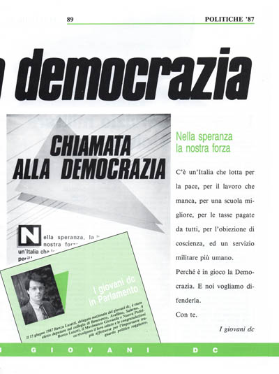 Dobbiamo renderci conto che è alle porte un cambiamento radicale della società e dello Stato, quindi aumentare o diminuire anche di poco certi consensi significa agevolare o meno questo o quel processo culturale di rinnovamento. Un processo che per noi giovani DC coinvolgerà la scuola, l'ambiente, il lavoro, la casa, la famiglia, la burocrazia, le istituzioni, tutti luoghi dove noi desideriamo impegnarci.