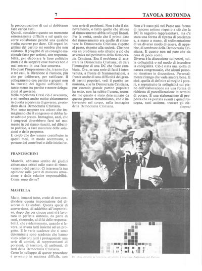 Uno dei temi più importanti è senza dubbio quello del rapporto tra DC e il mondo cattolico. lo sono d'accordo con chi teorizza all'interno della DC che non è possibile affrontare questi temi con confusione di ruoli o con ritorni al passato. Questo tema si affronta se si tiene presente che la nostra capacità di sintonizzarci con il mondo cattolico è direttamente proporzionale alla capacità di garantire i valori sotto il profilo della concreta tutela legislativa e non delegando il rinnovamento del Partito alla cooptazione di quadri dei vertici dei movimenti.