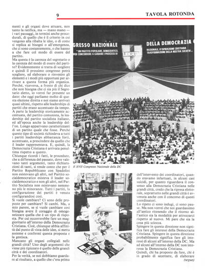 Ora mi pare che, con l'eccezione di Moro, il quale per quel che ho letto cercava di rincorrere il partito e se possibile di portarlo tutto insieme su certe scelte, non mi pare che si profili per ora questo tipo di soluzione o che si profili un leader del genere, in fondo a tutto ciò c'è una richiesta di decisionalità, una richiesta di iniziativa. Però poi nella realtà di tutti i giorni un segretario nazionale si trova sempre aricontrattare comunque tutto, dovendo scegliere per forza una posizione di centro che però sembra quasi sempre una posizione di paralisi. In pratica ogni volta che c'è un'iniziativa, da qualunque parte venga, e questo credo valga anche per il futuro, un qualunque segretario pur eletto dal Congresso deve sempre abbandonare la sua indicazione originaria, da qualunque parte della DC venga, e deve perciò ricontrattare e quindi trovarsi nuovamente in una posizione di mediazione.