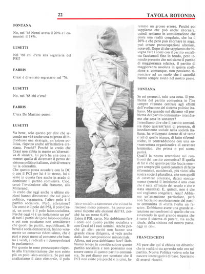Detto questo, io volevo solo in questa ultima fase riferirmi a Bambagioni e a Sandro Fontana. Io credo che la teoria del bipolarismo abbia avuto anche un sapore tattico, più che strategico. Cioè, di fronte alla tradizionale politica del partito socialista... lo poi non so, scusate la digressione, Sandro, se Craxi era al posto di Nenni cosa avrebbe fatto, perché Craxi è indubbiamente una persona capace sul piano politico, però vi erano anche condizioni storiche ben determinate e, quindi...