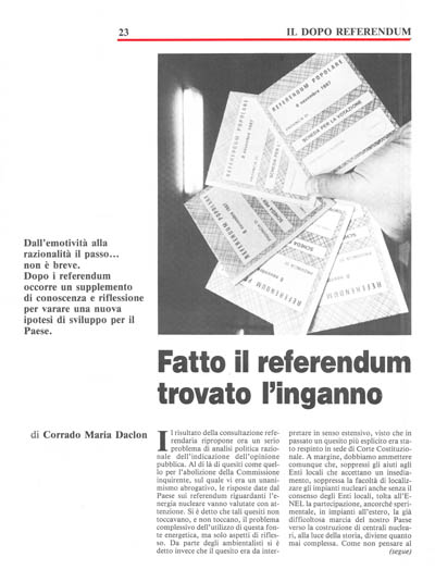 I1 risultato della consultazione referendaria ripropone ora un serio problema di analisi politica razionale dell'indicazione dell'opinione pubblica. Al di là di quesiti come quello per l'abolizione della Commissione inquirente, sul quale vi era un unanimismo abrogativo, le risposte date dal Paese sui referendum riguardanti l'energia nucleare vanno valutate con attenzione. Si è detto che tali quesiti non toccavano, e non toccano, il problema complessivo dell'utilizzo di questa fonte energetica, ma solo aspetti di riflesso. Da parte degli ambientalisti si è detto invece che il quesito era da interpretare in senso estensivo, visto che in passato un quesito più esplicito era stato respinto in sede di Corte Costituzionale. A margine, dobbiamo ammettere comunque che, soppressi gli aiuti agli Enti locali che accettano un insediamento, soppressa la facoltà di localizzare gli impianti nucleari anche senza il consenso degli Enti locali, tolta all'ENEL la partecipazione, ancorché sperimentale, in impianti all'estero, la già difficoltosa marcia del nostro Paese verso la costruzione di centrali nucleari, alla luce della storia, diviene quanto mai complessa. Come non pensare al ridimensionamento, diremmo strategico, a cui si giunti dal primo progetto Donat Cattin che prevedeva un numero di centrali pari percentualmente a quelle francesi oggi? E tutto senza una pronuncia referendaria così netta.