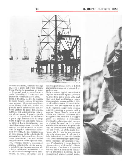 Si discute tanto oggi di valutazione di impatto ambientale. Questa procedura, introdotta per la prima volta negli Stati Uniti degli anni Settanta, poneva come requisito imprescindibile il diritto all'ambiente come diritto all'informazione, alla partecipazione, all'azione. Se vogliamo recepire nella sostanza la direttiva europea in materia, e più in generale l'intera filosofia che ne sta alla base non possiamo trascurare, oltre al rapporto tra ambiente e sviluppo, quello tra ambiente e democrazia. Questi referendum sono stati purtroppo sfruttati da alcuni partiti, in prima analisi quello socialista, sia prima che sopo la consultazione elettorale, con fini non propri. La DC ha avuto il coraggio, che le viene da una coerenza più volte dimostrata, di adeguarsi a delle indicazioni di voto che sarebbe stato spontaneo respingere per non apparire «accodati» al Comitato promotore. L'indicazione è venuta invece in piena coscienza, al di fuori di tali condizionamenti. Ora si tratta di compiere lo stesso passo. E di riflettere e analizzare le prospettive molteplici: la non costruzione di ulteriori centrali nucleari; lo smantellamento di quelle esistenti; la metanizzazione di quelle esistenti e future; la costruzione di piccoli impianti a turbogas; la costruzione di altre centrali nucleari; eccetera. Alcune di queste ipotesi sono poco proponibili, ad esempio le ultime due; altre possono essere complementari. Tuttavia, spetta al Parlamento interpretare normativamente le indicazioni di voto: l'Ente energetico nazionale attende ormai da molti mesi una indicazione sulla strada da intraprendere, che non necessariamente deve essere quella nucleare, ma che comunque dovrà essere una strada. Su questo non è possibile transigere. L'ENEL ha assicurato di poter garantire il fabbisogno energetico a patto che si indichi con chiarezza cosa deve fare (la garanzia non comprende però i costi di produzione, che varieranno secondo la fonte energetica dominante che scaturirà dal nuovo Piano energetico nazionale).