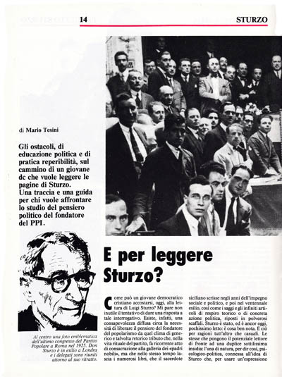 "Non si può tornare all'antico, nessuno è disposto a ripetere il passato: ogni generazione deve fare la propria esperienza anche sbagliando. Che i soliti tutori dell'ordine non comincino a gridare che c'è del disordine in questo mondo; ce ne sarà di sicuro dopo tanto preteso ordine. Per arrivare ad un ordine è certo che si deve passare dal disordine. I bigotti dell'ordine è bene che lo sappiano. L'importante è fissare dove si vorrà arrivare e cercare di adottare i mezzi più convenienti e rapidi per evitare ritardi ingiustificati, delusioni opprimenti e diffidenze insidiose"[1]. Indubbiamente una bella citazione, ricca di implicazioni e di significati profondi per la generazione del post '68. Ma anche, in un certo senso, la testimonianza della necessità di riaccreditare, per dir così «a sinistra», e non senza qualche imbarazzo, una immagine di Sturzo alternativa allo stereotipo corrente, cristallizzato dalle vicende dell'ultimo decennio di vita del sacerdote di Caltagirone percepito allora, e per lunghi anni dopo la sua morte, come idealmente e politicamente «scomodo» per l'anima più dinamica e progressiva del partito, soprattutto nelle sue componenti giovanili e intellettuali.