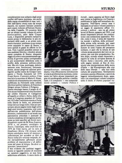 Queste antologie hanno il pregio di offrire alcuni fondamentali testi sturziani: dal celebre Discorso di Caltagirone all'appello ai «liberi e forti», dalla relazione al Congresso popolare di Torino nel 1923 alla Conferenza tenuta a Parigi sulla libertà in Italia, nei primissimi tempi del suo lungo esilio. Esse poi presentano alcune pagine tratte dagli scritti degli anni trenta e quaranta, così come dall'attività pubblicistica dell'ultimo decennio, consentendo in tal modo una panoramica articolata e puntuale di tutta la complessa ed eterogenea produzione su temi specifici: gli Scritti meridionalistici curati da De Rosa (Laterza, 1979) e, sul pensiero sociologico di Sturzo, l'antologia, edita anch'essa nel 1979 da Città nuova, per la cura di Gianfranco Morra. Chi trovasse nella lettura antologica motivi di interesse e sollecitazioni per accedere ai libri di Sturzo nella loro versione integrale, dovrà inevitabilmente affrontare alcuni problemi di impostazione e di definizione del piano di lettura. Da dove cominciare, innanzitutto?