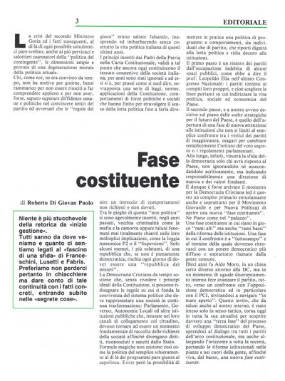 E dunque è forse arrivato il momento per la Democrazia Cristiana (ed è questo un compito primario entusiamante anche e soprattutto per il Movimento Giovanile e per Nuova Politica) di aprire una nuova "fase costituente". Ne Paese come nel "palazzo".