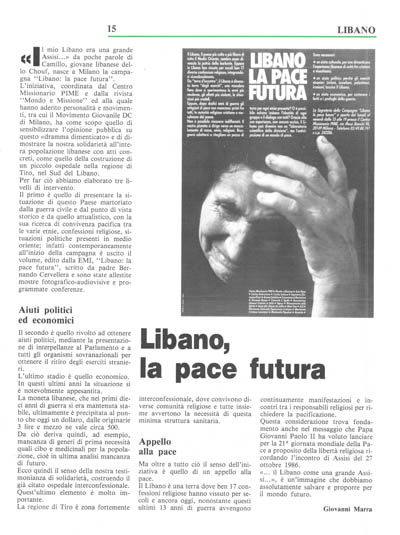 L'iniziativa, coordinata dal Centro Missionario PIME e dalla rivista "Mondo e Missione" ed alla quale hanno aderito personalità e movimenti, tra cui il Movimento Giovanile DC di Milano, ha come scopo quello di sensibilizzare l'opinione pubblica su questo «dramma dimenticato» e di dimostrare la nostra solidarietà all'intera popolazione libanese con atti concreti, come quello della costruzione di un piccolo ospedale nella regione di Tiro, nel Sud del Libano.