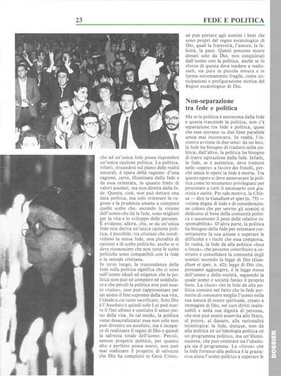 C'è, dunque, un'intima connessione tra l'ordine della creazione e l'ordine della redenzione, nel senso che il primo è ordinato al secondo e trova in esso il suo fine «ultimo» e il suo compimento «totale». Ma tale connessione non significa che l'ordine della creazione s'identifichi o si confonda con l'ordine della redenzione. Tra i due ordini c'è unione, ma nello stesso tempo distinzione. Cioè, da un lato, l'ordine della creazione, e perciò la politica che ne fa parte, ha una sua autonomia rispetto all'ordine della grazia, e quindi rispetto alla fede, e questa ha una sua trascendenza rispetto alla politica; da l'altro lato, la politica non è «separata» dalla fede.