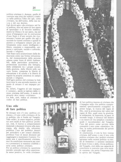 Se dunque non c'è una «politica cristiana», c'è uno «stile cristiano» di fare politica, che si fonda sul Vangelo. Tale «stile», in senso negativo, proibisce certi modi di fare politica: proibisce, cioè, il ricorso a comportamenti immorali e disonesti (ricorso alla menzogna, alla slealtà, alla calunnia); proibisce l'uso del pubblico danaro per arricchirsi e per crearsi clientele; proibisce l'uso di mezzi disonesti per raggiungere e mantenere il potere: l'onestà non è specificamente cristiana, ma è la condizione necessaria per essere e presentarsi in maniera credibile e seria come politico cristiano.