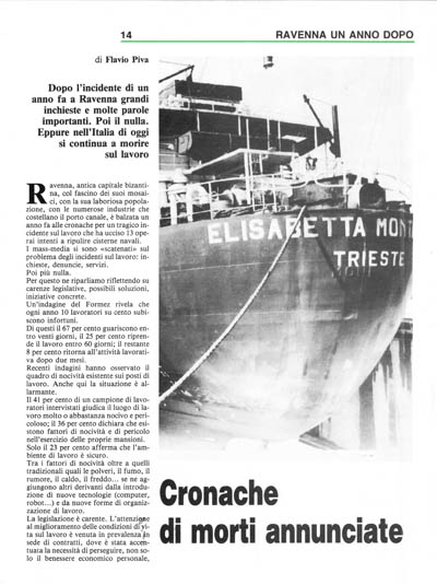 Ravenna, antica capitale bizantina, col fascino dei suoi mosaici, con la sua laboriosa popolazione, con le numerose industrie che costellano il porto canale, è balzata un anno fa alle cronache per un tragico incidente sul lavoro che ha ucciso 13 operai intenti a ripulire cisterne navali.