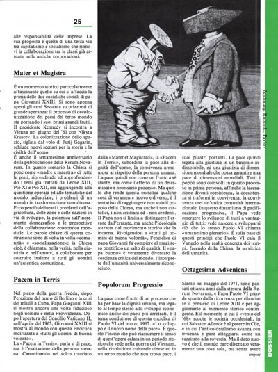 È un momento storico particolarmente affascinante quello su cui si affaccia la prima delle due encicliche sociali di papa Giovanni XXIII. Si sono appena aperti gli anni Sessanta su orizzonti di grande speranza: il processo di decolonizzazione dei paesi del terzo mondo sta portando i suoi primi grandi frutti. Il presidente Kennedy si incontra a Vienna nel giugno del '61 con Nikyta Kruscev. La colonizzazione dello spazio, siglata dal volo di Jurij Gagarin, schiude nuovi scenari per la storia ·e la civiltà dell'uomo.
