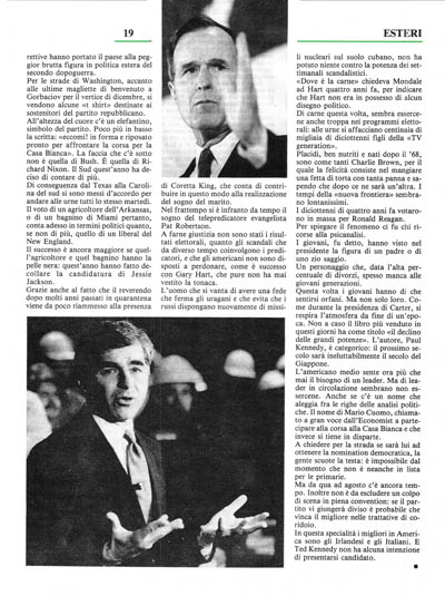 I democratici sono un po' nei guai: a Mikael Dukakis manca un nome che suoni meno mediterraneo e più anglosassone. Ma ad Albert Gore manca il carisma. A Jessie Jackson, che di carisma invece ne ha da vendere, manca anche la più elementare esperienza di· amministrazione di un ente pubblico. Figuriamoci se un giorno, affermano in molti, dovesse essere lui ad amministrare il Paese. I repubblicani invece hanno trovato in George Bush un insospettato leader. La stampa adesso gli dedica maggiore attenzione e lo guarda con un po' più di deferenza.