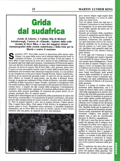 Settembre 1977. Steve Biko muore in detenzione nelle carceri sudafricane. La causa della morte verrà indicata dalle autorità locali in «sciopero di fame». La verità è però un'altra. E ben più amara. A Steve Biko è stata riservata la sorte che a decine di neri sudafricani tocca da quando agli inizi degli anni sessanta, il parlamento di Pretoria ha approvato con decreto il principio della detenzione a tempo indeterminato senza processo: la morte in carcere. Ma di Steve Biko, alto, giovane, pizzo sotto il mento ed una personalità intensa come il colore della propria pelle, probabilmente non avremmo mai conosciuto neanche il nome, se a raccontarci la sua vicenda non avesse provveduto Donald Woods, bianco sudafricano, direttore di un autorevole giornale locale. È stato lui che ha raccolto nel libro «Biko» la vicenda di quest'uomo, che ha dato a Richard Attenbourgh, lo spunto per realizzare il film «Grido di libertà», che dalle vicende pubbliche di Biko racconta le tappe. Freddo, razionale e conseguente nella sua analisi politica, Biko è il capo carismatico del nascente movimento «coscienza nera». L'analisi che egli compie della situazione è estremamente semplice: i neri sudafricani, mancano di coscienza della propria cultura, di coscienza delle proprie possibilità, di coscienza dei propri diritti, di coscienza, possiamo dire, di «potere essere».