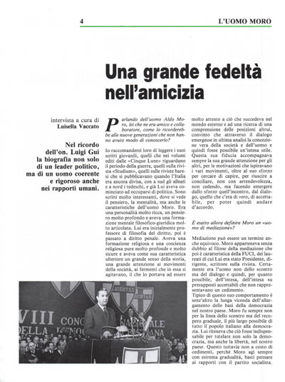 Io non so se avrebbero ucciso Moro in ogni caso, ma la DC non ha potuto non assumere una posizione di fermezza, di difesa dello stato perché era giusto, ma anche perché la questione era degenerata in una concorrenza tra forze politiche che secondo me non è stata molto bella. Sono state certamente settimane di grande pena, di grande disagio. lo sono stato anche interpellato in una di quelle lettere in cui Moro dice di non approvare la tesi della ragion di stato, non perché coinvolgeva lui, ma perché aveva sempre ritenuto che la vita umana fosse il valore primo, più valido della ragion di stato stessa, e che perciò Lui non accettava le argomentazioni proposte dalle forze politiche nella disputa pubblica cui accennavo prima. E si è appellato alla mia testimonianza dicendo: «Come sa Gui...», perché, quando io ero ministro dell'interno, qualche anno prima del '75, ed era di grande attualità la questione dei sequestri di persona, pensavo di fare una legge che disponeva preventivamente il blocco di tutte le disponibilità economiche dei sequestrati per togliere un incentivo ai malviventi. Preparai un abbozzo di legge, ne discutemmo, ma lui non fu d'accordo e mi disse: «Io non sono d'accordo perché se poi ti capita che sequestrano una persona ugualmente tu che fai? I soldi non glieli puoi dare, allora, o infrangi la legge o devi far morire una persona. Ma la vita di una persona vale più di tutto, quindi non ti devi mettere nella condizione di dover scegliere tra la vita di un uomo o il violare la legge» e io non presentai il disegno di legge. Moro invocò questo precedente e io feci una dichiarazione affermando che era così; quindi furono settimane di grande disagio, di grande pena. Alla fine il presidente Leone, dato che era in una delle lettere di Moro si accennava al fatto che le B.R. si sarebbero accontentate della liberazione di una persona mentre prima volevano la liberazione di tutti i loro detenuti, allora si preparò a fare un decreto di grazia per uno di questi brigatisti che in prigione ammalato, ma l'operazione non poté andare in porto in quanto tra le B.R. tra loro stesse divise, prevalsero gli intransigenti, i quali, per evitare che la disputa al loro interno dovesse continuare, ammazzarono Moro.