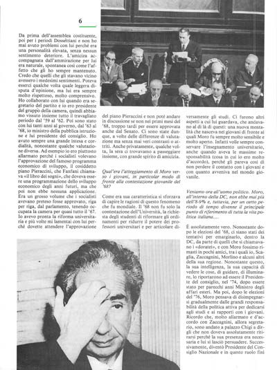 lo raccomanderei loro di leggere i suoi scritti giovanili, quelli che nei volumi editi dalle «Cinque Lune» riguardano il periodo della guerra, quelli sulla rivista «Studium», quelli sulle riviste baresi che si pubblicavano quando l'Italia era ancora divisa, con a sud gli alleati e a nord i tedeschi, e già Lui aveva cominciato ad occuparsi di politica. Sono scritti molto interessanti, dove si vede il pensiero, la mentalità, ma anche le caratteristiche dell'uomo Moro. Era una personalità molto ricca, un pensiero molto profondo e aveva una formazione mentale filosofico-giuridica molto articolata. Lui era inizialmente professore di filosofia del diritto, poi è passato a diritto penale. Aveva una formazione religiosa e una coscienza religiosa pure molto profonde e molto sicure e aveva come sua caratteristica ulteriore un grande senso della storia, una grande attenzione ai movimenti della società, ai fermenti che in essa si agitavano, il che lo portava ad essere molto attento a ciò che succedeva nel mondo esterno e ad una ricerca di una comprensione delle posizioni altrui, convinto che attraverso il dialogo emergesse in ultima analisi la concezione vera della società e dell'uomo e quindi fosse possibile un'intesa utile. Questa sua fiducia accompagnava sempre la sua grande attenzione per gli altri, per le motivazioni che ispiravano i vari movimenti, oltre al suo sforzo per cercare di capire, per riuscire a conciliare, non con arrendevolezza, non cedendo, ma facendo emergere dallo sforzo quell'incontro, dal dialogo, quello che c'era di vero, di accettabile, per poter quindi andare d'accordo.