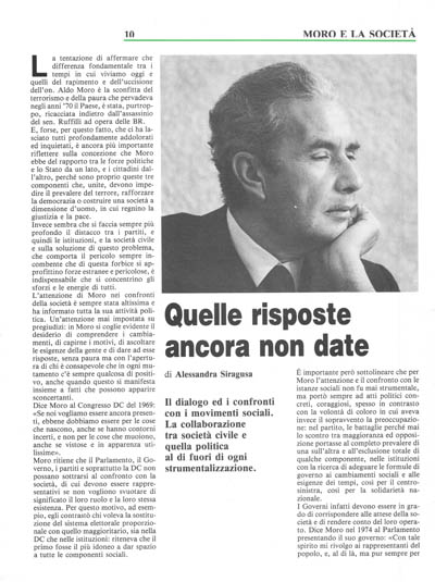 È importante però sottolineare che per Moro l'attenzione e il confronto con le istanze sociali non fu mai strumentale, ma portò sempre ad atti politici concreti, coraggiosi, spesso in contrasto con la volontà di coloro in cui aveva invece il sopravvento la preoccupazione: nel partito, le battaglie perché mai lo scontro tra maggioranza ed opposizione portasse al completo prevalere di una sull'altra e all'esclusione totale di qualche componente, nelle istituzioni con la ricerca di adeguare le formule di governo ai cambiamenti sociali e alle esigenze dei tempi, così per il centrosinistra, così per la solidarietà nazionale.