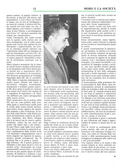 L'attenzione di Moro nei confronti della società è sempre stata altissima e ha informato tutta la sua attività politica. Un'attenzione mai impostata su pregiudizi: in Moro si coglie evidente il desiderio di comprendere i cambiamenti, di capirne i motivi, di ascoltare le esigenze della gente e di dare ad esse risposte, senza paura ma con l'apertura di chi è consapevole che in ogni mutamento c'è sempre qualcosa di positivo, anche quando questo si manifesta insieme a fatti che possono apparire sconcertanti.