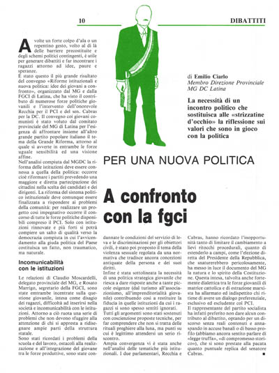 È stato questo il più grande risultato del convegno «Riforme istituzionali e nuova politica: idee dei giovani a confronto», organizzato dal MG e dalla FGCI di Latina, che ha visto il contributo di numerose forze politiche giovanili e l'intervento dell'onorevole Recchia per il PCI e del sen. Cabras per la DC. Il convegno coi giovani comunisti è stato voluto dal comitato provinciale del MG di Latina per l'esigenza di affrontare insieme all'altro grande partito popolare italiano il tema della Grande Riforma, attorno al quale si avverte in entrambe le forze uguale sensibilità ed una visione affine.