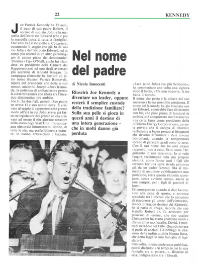 Il nome che porta è la chiave del suo successo e la sua possibile condanna. Il nome dei Kennedy ha già bruciato suo zio Edward, e potrebbe fare altrettanto con lui, che pure prima di lanciarsi in politica si è conquistato meritatamente una certa fama come presidente della «Citizens Energy Corporation», un ente privato che si occupa di rifornire carburante a basso prezzo ai bisognosi che devono affrontare i duri inverni bostoniani, quando la temperatura scende di parecchi gradi sotto lo zero. Con il suo nome Joe ha uno strano rapporto, non a caso. Se si tocca l'argomento in una intervista, lo si vede reagire reclamando una sua propria identità, come fanno tutti i figli che cercano fortuna sulla strada percorsa già da un padre famoso. Ma al momento di assumere pubblicamente una posizione, tutta questa ritrosità scompare, come avviene spesso, anche se non sempre, per i figli di genitori illustri.