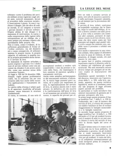 Ecco, dunque, che l'obbligo di leva diviene un obbligo di servizio alla comunità (con modalità varie a seconda delle vocazioni personali) per un determinato periodo di tempo ed una occasione educativa preziosa perché tale servizio diventi anche un'esperienza di vita. Per questi motivi l'attuale normativa sul servizio militare ci sembra carente; e ci pare, oggi, improcrastinabile un servizio di leva che sia effettivo momento di crescita personale, culturale e civica.