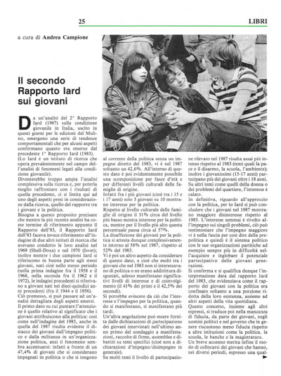 Si conferma e si qualifica dunque l'interpretazione data dal rapporto lard del 1983, che evidenziava come il rapporto dei giovani con la politica era confinato soltanto a una porzione ridotta della loro esistenza, assieme ad altri aspetti della vita quotidiana.