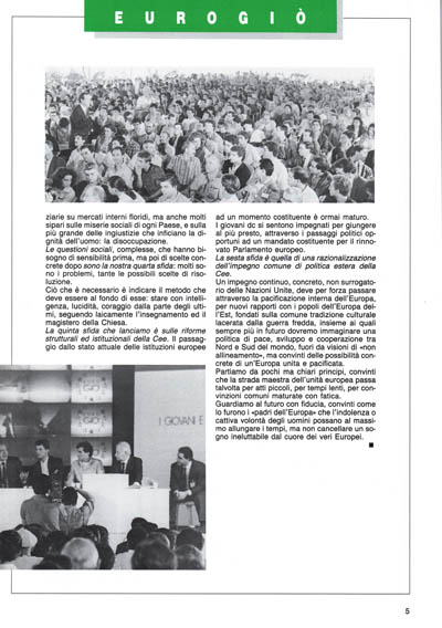 I giovani dc italiani riuniti a convegno a Marina di Ugento nel loro festival nazionale 1988-Euro Gio' tenuto conto del dibattito promosso nelle commissioni di studio, dei documenti elaborati dal Centro nazionale, convinti della necessità di accelerare i passaggi politici e diplomatici per la costruzione di un'Europa unita, riaffermano la loro fede nell'ideale europeista nato dalle ceneri del secondo conflitto mondiale e di cui primi fautori furono Schuman, Adenauer e De Gasperi.