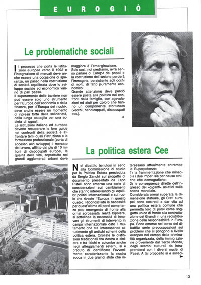 Considerata ormai superata la dimensione statuale, gli Stati europei sono costretti a dar vita ad una politica estera comune che permetta loro di porsi come soggetto unico di fronte alla contrattazione dei Grandi in una redistribuzione delle responsabilità in Europa. Sono emerse nel corso del dibattito serie preoccupazioni sui problemi che si pongono a livello europeo nel campo della criminalità organizzata, della immigrazione proveniente dal Terzo Mondo, degli scambi culturali da intraprendersi con i diversi nuclei di Paesi. A tal proposito si è sollecitato, pur non inserendolo nel documento, la proroga della legge 943 che permetta agli stranieri presenti in Italia di regolare la loro posizione. Si è sollevato il problema di una legislazione comune nel settore della tutela ambientale e del rispetto e della tutela dei diritti umani e delle libertà fondamentali, specialmente per quanto concerne le gravi violazioni che continuano a vedere come protagonisti i paesi membri della Cee. Si è riflettuto sui problemi che si verranno a creare con l'abbattimento delle frontiere che vedranno un'Europa divisa tra chi ha saputo organizzarsi a livello economico ed industriale e chi invece non è riuscito per vari motivi in questo intento e si è parlato pertanto di istituzionalizzare i meccanismi di redistribuzione delle risorse. Serie preoccupazioni sono sorte sulla questione del commercio delle armi e su una possibile riconversione, da una parte, e un meccanismo di controlli che contribuisca a renderlo più trasparente, dall'altra. Si è voluto sottolineare inoltre il fatto che è necessario, dar vita ad una classe dirigente europea che sia realmente impegnata e sensibile nei confronti dei problemi che si pongono. Relativamente poi alla questione dei rapporti con il blocco europeo orientale, si è sollecitata una presa di posizione più precisa sulla questione delle due Germanie e sul superamento di una realtà ormai espressione di una logica di guerra fredda in fase di superamento, adesso che l'unificazione politica europea può rendere realmente definitivo uno stato di cose fondato su una innaturale divisione dell'Europa. Ci sono state nel corso della discussione espressioni di timore nei confronti del nuovo corso che sta interessando l'Urss di Gorbaciov, anche se controbattute da uno spirito di fiducia e di sollecitazione nei confronti di mutamenti dai quali non possiamo che tram vantaggi sia a livello economico che politicostrategico.