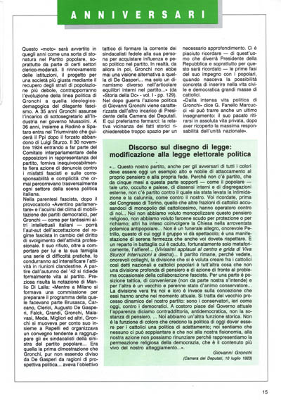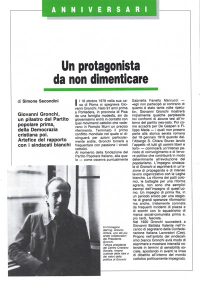 Il 18 ottobre 1978 nella sua casa di Roma si spegneva Giovanni Gronchi. Nato 91 anni prima a Pontedera, in provincia di Pisa da una famiglia modesfa, sin da giovanissimo entrò in contatto con quei movimenti cattolici che vedevano in Romolo Murri un preciso riferimento. Terminato il primo conflitto mondiale nel quale si distinguerà per azioni particolarmente ardite, Gronchi tornerà a frequentare con passione i circoli cattolici.