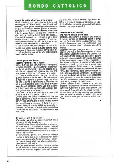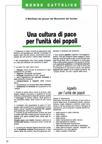 «Sarà l'inizio di una nuova era – è detto nel messaggio di Chiara Lubich per l'unità del mondo – quel giorno in cui i popoli non saranno più racchiusi nel proprio guscio a contemplare la propria bellezza e a tenersi stretti con i denti i propri tesori, ma sapranno metterli a çisposizione per lo sviluppo degli altri popoli... E arrivato il momento in cui la patria altrui deve essere armata come la propria... Corra con flusso ininterrotto la carità fra terra e terra, torrente di beni strumentali e materiali...