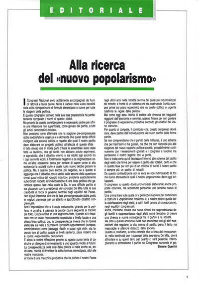 Anzi l'impressione che si è avuta nettamente, girando per la periferia, è un'altra: è passata la grande paura seguente al tracollo del 1983. Grazie anche ad una segreteria forte, il partito si è rinsaldato con un reale rinnovamento soprattutto a livello locale e una chiara linea politica; ora, la consapevolezza invece che la ripresa elettorale sia reale e ci presenti i prossimi appuntamenti (europee, amministrative) come passaggi «facili» e quasi «già vinti», sta facendo fare al partito, specie ai livelli periferici, passi indietro che è nostra responsabilità denunciare.