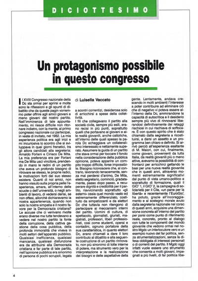 Il XVIII Congresso nazionale della Dc sta ormai per aprirsi e molte sono le riflessioni e gli spunti di dibattito che da queste pagin vorremmo poter offrire agli amici giovani e meno giovani del nostro partito. Nell'imminenza di tale appuntamento, mi riesce difficile non ritornare indietro, con la mente, al primo congresso nazionale cui partecipai, in veste di invitato, nel 1982. La mia esperienza politica era agli inizi e mi incuriosiva lo scontro che si sviluppava in quei giorni frenetici, tra gli allora candidati alla segreteria: Arnaldo Forlani e Ciriaco De Mita. La mia preferenza era per Forlani ma De Mita uscì vincitore, prendendo in mano le redini di un partito che aveva un profondo bisogno di ritrovare se stesso, le proprie radici, le motivazioni forti del suo stesso esistere. Quanti di noi amici, non hanno vissuto sulla propria pelle l'esperienza, amara, all'interno delle scuole o dell'università, o negli ambienti di lavoro, di vedersi derisi, se non offesi, allorché dichiaravamo la nostra appartenenza, quando non solo la nostra simpatia e il nostro favore per la Democrazia cristiana? Le accuse che ci venivano rivolte erano diverse ma tutte tendevano a vedere nel nostro partito la fonte della corruzione, della cattiva gestione della cosa pubblica, della profonda immoralità che viveva in molti settori dell'apparato pubblico. Qualsiasi inefficienza, qualsiasi mancanza, qualsiasi disfunzione era da attribuirsi alla Democrazia cristiana e far parte di tale partito, nell'opinione pubblica era sinonimo di persona di pochi scrupoli, legata a scontri correntizi, desiderosa solo di arricchirsi a spese della collettività.