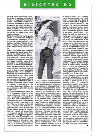 tà, è altresì vero che il lavoro di rinnovamento per la costruzione di un rapporto più solido tra il nostro partito e la società civile non è certo concluso e sbaglia completamente chi crede di potersi sedere sugli allori pensando che ormai il compito di rinnovare così come quello di chi in questi anni si è fatto carico, sulle proprie spalle, rischiando in prima persona, con molte spesso difficili e la stima, il rispetto e il riconoscimento sincero del valore per chi all'interno del partito dimostrava di avere la linea ritenuta migliore. Il momento politico delicato e l'aggressività del partito socialista che aspetta ogni nostro minimo passo falso per sferrare attacchi feroci, non ci consentono gelosie o timori di «eccessivi rafforzamenti» di un leader. Sarebbe ritornare ai vecchi metodi e al vecchio fantasma che ci auguriamo ormai sepolto, di un partito diviso da personalismi o da gruppi in lotta l'uno contro l'altro per il potere. Non è questa la Dc che come giovani vogliamo e tantomeno la Dc di cui il paese ha bisogno per una guida stabile e in grado di risolvere i non semplici problemi, quali la droga, la disoccupazione, le nuove emarginazioni oltre che quelli economici, che da troppo tempo lo tormentano, senza che si sia trovato il modo di dar loro soluzioni. Su tali problematiche purtroppo, troppo spesso, occupati in questioni di gestione di potere interno, arriviamo tardi, con proposte scoordinate e ben lontane dall'avere l'impatto che altre, di altri partiti hanno sull'opinione pubblica per la quale assumiamo il ruolo di «secondi».