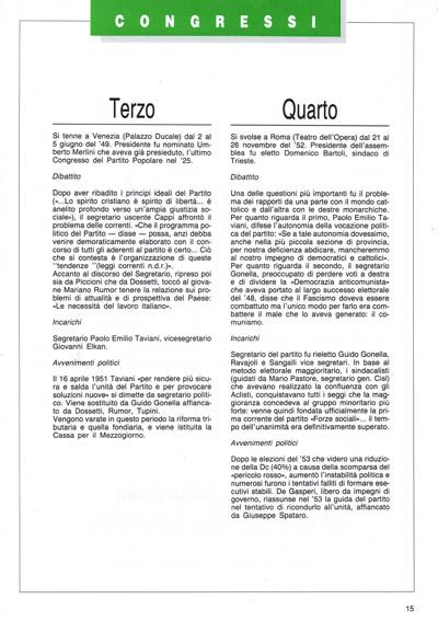 Dopo aver ribadito i principi ideali del Partito («...Lo spirito cristiano è spirito di libertà... è anelito profondo versç un'ampia giustizia sociale»), il segretario uscente Cappi affrontò il problema delle correnti. «Che il programma politico del Partito – disse – possa, anzi debba venire demoraticaniente elaborato con il concorso di tutti gli aderenti al partito è certo... Ciò che si contesta è l'organizzazione di queste "tendenze" (leggi correnti n.d.r.)».