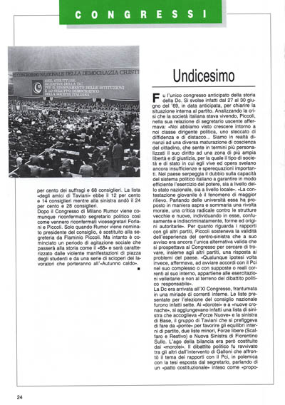 De Mita invece dissente radicalmènte dall'impostazione data da Rumor che accusa di essere arroccato su posizioni superate, preconciliari, dell'epoca centrista, di ostacolare il governo Moro, di essere fuori della realtà, preso dalla sola gestione del potere. De Mita accusa Rumor e i dorotei di gestire il partito in modo «disseducativo, autenticamente e obiettivamente corruttore della dialettica democratica all'interno di un partito. Questa è per lui, l'origine dell'immoblisrr\o della Dc e l'origine del disperdersi delle energie giovanili. È come se noi ci addormentassimo su una visione della realtà ormai superata, senza renderci conto che sopra questa superficie, come su un lago, noi stiamo ballando, mentre sotto c'è l'acqua. Guai, quando si scioglierà il giacchio: precipiteremo tutti, sarà la fine delle forze politiche del paese». Alla linea di Rumor, al Congresso, andò il 64 per cento dei suffragi e 68 consiglieri. La lista «degli amici di Taviani» ebbe il 12 per cento e 14 consiglieri mentre alla sinistra andò il 24 per cento e 28 consiglieri.