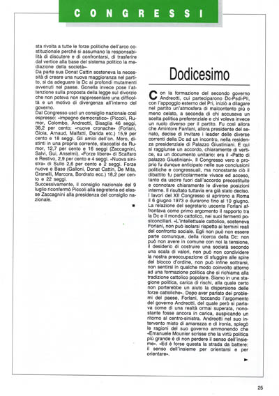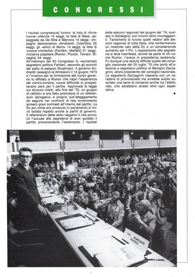 All'indomani del XII Congresso fu «acclamato segretario politico Fanfani, secondo gli accordi del patto di palazzo Giustiniani. Il governo Andreotti rassegnò le dimissioni il 12 giugno 1973 e l'incarico per la formazione del nuovo governo fu affidato a Rumor che riaprì l'esperienza del centro-sinistra; nuove difficoltà si prospettavano però per il partito. Approvata la legge sul divorzio infatti, alla fine del '70, un gruppo di cattolici si era fatto promotore di un referendum abrogativo e proprio sull'atteggiamento da seguire nei confronti di tale avvenimento sorsero gravi contrasti all'interno del partito. La Dc poi come era avvenuto in parlamento si trovò isolata rispetto anche ai partiti di governo. Il referendum dette esito negativo il che provocò l'accusa alla segreteria di aver guidato il partito provocandone l'isolamento. I risultati delle elezioni regionali del giugno del '74, svoltesi in Sardegna, non furono certo incoraggianti. Tantomeno lo furono quelli relativi alle elezioni regionali di tutta Italia, che confermarono un notevole calo della Dc e un considerevole aumento per il Pci. L'opposizione alla segreteria si fece manifesta, anche da parte di chi come Rumor, l'aveva in precedenza sostenuta. Fu dunque una seduta difficile quella del consiglio nazionale del 25 luglio '75 che portò all'elezione a segretario politico di Benigno Zaccagnini, allora presidente del consiglio nazionale. La segreteria Zaccagnini nasceva con un carattere di provvisorietà ma avrebbe subito suscitato una serie di consensi anche tra l'elettorato, che sarebbero andati oltre ogni aspettativa.