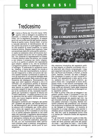 Si tenne a Roma dal 18 al 24 marzo 1976, «aperto» oltre ai delegati e al pubblico tradizionale, a moltissimi altri invitati. Sembrava infatti, con la segreteria Zaccagnini, di essere giunti ad una svolta perché egli parlava apertamente di partito nuovo. Diceva infatti: «il primo e naturale elemento di identificazione del nostro partito sta proprio in quell'aggettivo cristiano che qualifica la nostra presenza, la nostra iniziativa politica. Bisogna però superare l'idea convenzionale della Dc come partito cattolico... in realtà noi dobbiamo rifarci all'intuizione sturziana e ribadire che la Dc non è il partito cattolico, non pretende di rappresentare la Chiesa, il mondo cattolico nella vita politica, non chiede e non ottiene il consenso per motivi religiosi. La Dc è un partito di cattolici che rappresenta quei cittadini, cattolici e no, che ne accettano il programma politico e la sostengono con il loro suffragio». E sollevando la «questione morale», ribadiva: «il tema dei rapporti tra morale e politica, il rifiuto del macchiavellismo, la denuncia del malgoverno e della corruzione del vecchio assetto fascista e prefascista di potere furono gli argomenti di una grande battaglia della generazione dei popolari della nostra prima generazione del dopoguerra. Riconosciamo che oggi quei valori appaiono offuscati e che si è verificata una progressiva perdita di tensione morale nella nostra battaglia politica. Riprendere slancio su questi temi, essere noi stessi promotori esigenti di rigore morale diventa oggi per la Dc condizione di vita, necessità improrogabile per riprendere il rapporto di fiducia con il nostro elettorato». «Il paese guarda a noi con la speranza che dal nostro rinnovamento incominci una nuova stagione storica, un diverso cammino dell'italia».