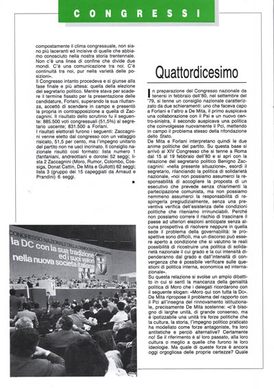 De Mita rappresenta il cambiamento, la nuova Dc. Ed infatti anche gli esterni sono con lui. La sua candidatura era infatti già emersa dal- 1'Assemblea nazionale aperta agli esterni del novembre del 1981 in cui De Mita appariva come il leader della rifondazione della Dc, che cerca una nuova legittimazione attraverso il consenso del popolo democristiano. Compito di un partito in crisi è infatti per De Mita «la riscoperta delle ragioni culturali che hanno caratterizzato la sua presenza e la sua forza in una società, l'adeguamento delle strutture e il rinnovamento se è il caso del personale dirigente». La sua relazione puntava tutto sul recupero delle ragioni ideali del partito e sulla ricostruzione del radicamento sociale della Dc. Per attuare questo compito De Mita auspicava l'elezione diretta del segretario da parte del Congresso che lo vedrà vincitore nella contrapposizione con Forlani, sceso in campo all'ultimo minuto, facendosi sostenitore dell'alleanza con i socialisti, in alternativa alla linea di De Mita che mette in primo piano l'adesione del sistema verso la democrazia compiuta.