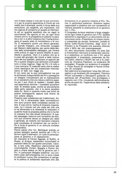 E non tanto per le sue contraddizioni ma per la dichiarata indisponibilità del Pci a perseguire un disegno rivoluzionario per la realizzazione di un socialismo che ora riesce a definire appena per il suo rifiuto di ripetere i modelli delle sue esperienze storiche: i cosiddetti socialismi reali. Si direbbe quasi, anche se storicamente dalla parte opposta, che è la storia parallela della Dc. Sono in qualche modo così simili da potersi contrapporre; eppure così diversi da non potersi alleare.