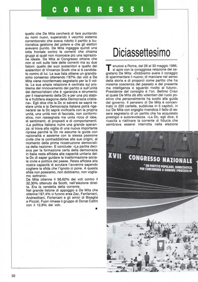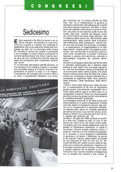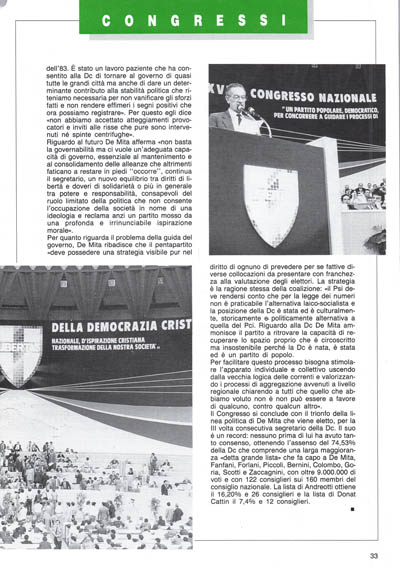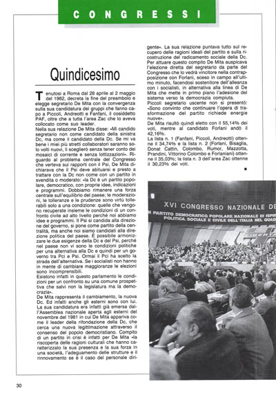 Eletto segretario De Mita ha davati a sé un fermo compito: riaccendere la comunicazione fra la gente e il partito non tradendo le aspettative che la sua elezione diretta dal Congresso ha dato con la promessa della nuova Dc. De Mita si muove con analisi in profondità e con strategie di ampio respiro avvertendo le correnti democristiane che rifarà il partito senza farsi da loro condizionare perché essendo eletto dal Congresso deve rispondere soltanto agli iscritti.