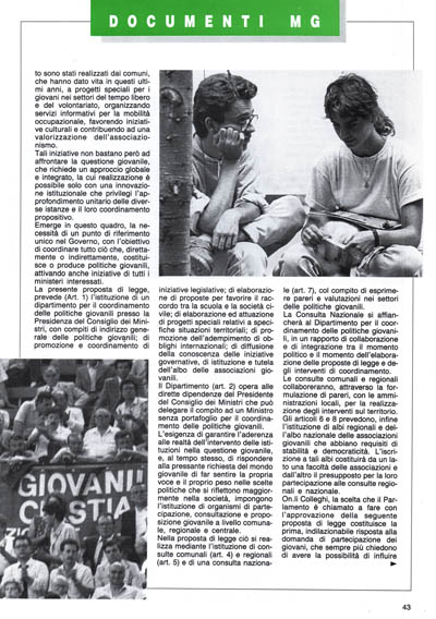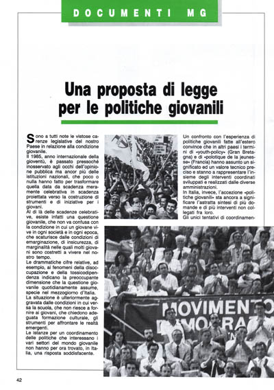 Il 1985, anno internazionale della gioventù, è passato pressoché inosservato agli occhi dell'opinione pubblica ma ancor più delle istituzioni nazionali, che poco o nulla hanno fatto per trasformare quella data da scadenza meramente celebrativa in scadenza , proiettata verso la costruzione di strumenti e di iniziative per i giovani.