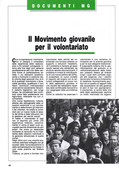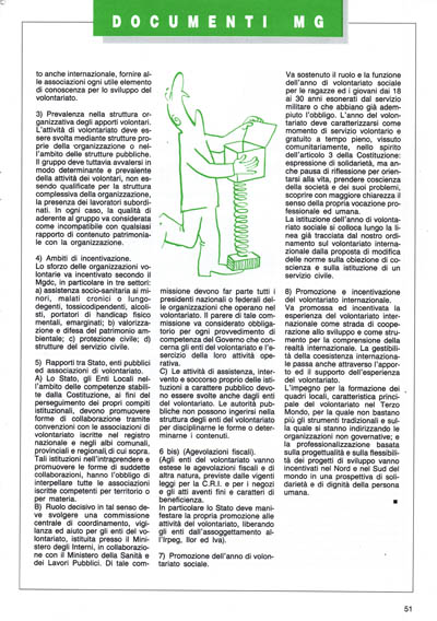 Va sostenuto il ruolo e la funzione dell'anno di volontariato sociale per le ragazze ed i giovani dai 18 ai 30 anni esonerati dal servizio0 militare o che abbiano già adempiuto l'obbligo. L'anno del volontariato deve caratterizzarsi come momento di servizio volontario e gratuito a tempo pieno, visto comunitariamente, nello spirito dell'articolo 3 della Costituzione: espressione di solidarietà, ma anche pausa di riflessione per orientarsi alla vita, prendere coscienza della società e dei suoi problemi, scoprire con maggiore chiarezza il senso della propria vocazione professionale ed umana.