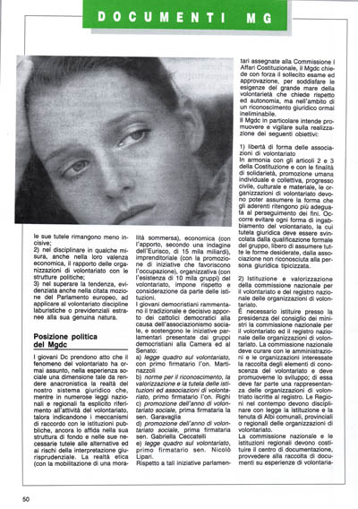 I giovani Dc prendono atto che il fenomeno del volontariato ha ormai assunto, nella esperienza sociale una dimensione tale da rendere anacronistica la realtà del nostro sistema giuridico che, mentre in numerose leggi nazionali e regionali fa esplicito riferimento all'attività del volontariato, talora indicandone i meccanismi di raccordo con le istituzioni pubbliche, ancora lo affida nella sua struttura di fondo e nelle sue necessarie tutele alle alternative ed ai rischi della interpretazione giurisprudenziale. La realtà etica (con la mobilitazione di una moralità sommersa}, economica (con l'apporto, secondo una indagine dell'Eurisco, di 15 mila miliardi), imprenditoriale (con la promozione di iniziative che favoriscono l'occupazione), organizzativa (con l'esistenza di 10 mila gruppi) del volontariato, impone rispetto e considerazione da parte delle istituzioni.